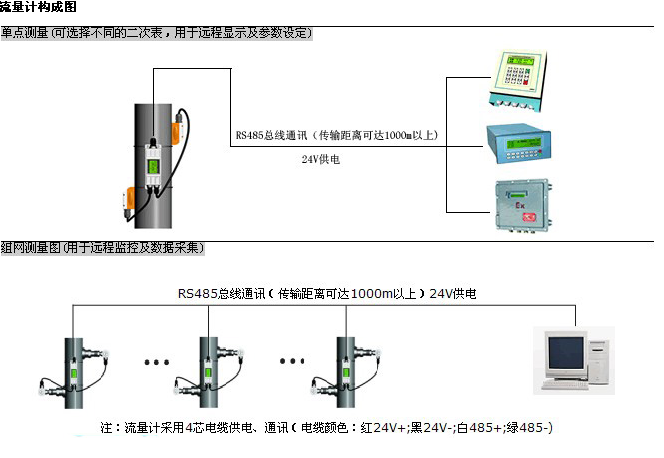 一次表與二次表(或計算機)之間采用RS-485總線通訊,采用普通電纜即可,傳輸距離可達1000米以上,組網(wǎng)十分方便、快捷。這種傳輸方式抗干擾能力強,解決了分體式超聲波流量計專用電纜成本高、抗干擾能力差、傳輸距離短等問題。