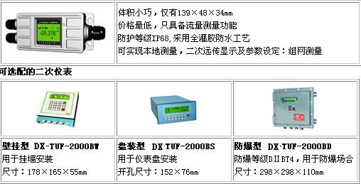 固定一體基本型超聲波流量計特點: 多重顯示 一次表在測量點即可完成測量,一次表可循環(huán)顯示累積流量、瞬時流量、流速等參數(shù),二次表