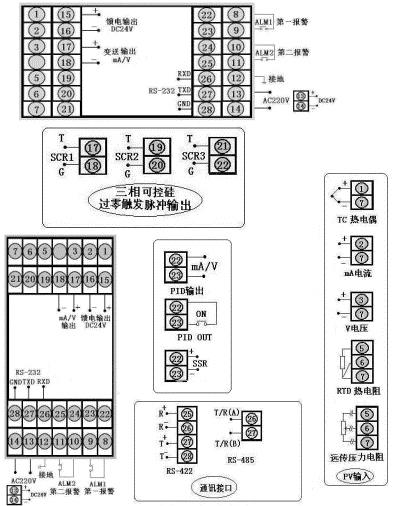 SCR--可控硅過零觸發(fā)脈沖輸出,SSR--固態(tài)繼電器控制輸出,SOT--雙向可控硅輸出