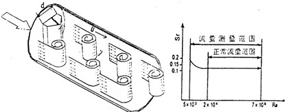 渦街流量計是由設(shè)計在流場中的旋渦發(fā)生體、檢測探頭及相應(yīng)的電子線路等組成。當流體流經(jīng)旋渦發(fā)生體時,它的兩側(cè)就形成了交替變化的兩排旋渦,這種旋渦被稱為卡門渦街。斯特羅哈爾在卡門渦街理論的基礎(chǔ)上又提出了卡門渦街的頻率與流體的流速成正比,并給出了頻率與流速的關(guān)系式: