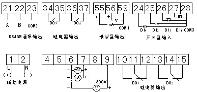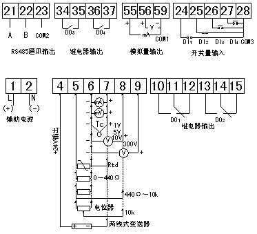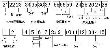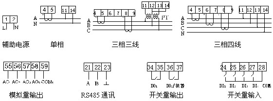 儀表可具有RS-485 通訊接口,采用Modbus-RTU 協(xié)議;可帶模擬量輸出、繼電器報(bào)警輸出、開關(guān)量輸入/輸出。根據(jù)不同要求,通過儀表面板按鍵,對變比、報(bào)警、通訊、開關(guān)量輸出進(jìn)行設(shè)置與控制。