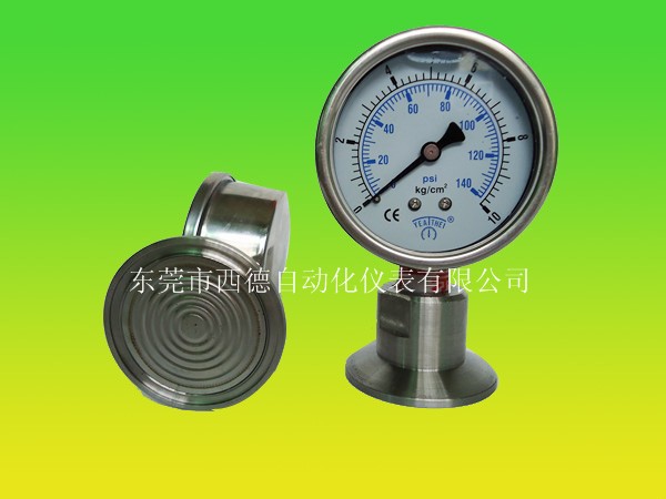 衛(wèi)生型隔膜壓力表表面直徑:60MM,100MM隔膜體外徑:1.5(50.5MM)或2(64MM)密封圈材質(zhì)為硅橡膠或聚四乙烯,符合藥品衛(wèi)生質(zhì)量規(guī)范GMP指