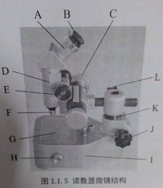 A .目鏡接筒 B. 測(cè)微目鏡C. 測(cè)微鼓輪D. 鏡筒E. 調(diào)焦旋鈕F. 物鏡G. 載物臺(tái)H. 反光鏡旋鈕I. 底座J. 鎖緊手輪ⅡK. 升降柱L. 鎖緊手輪Ⅰ。