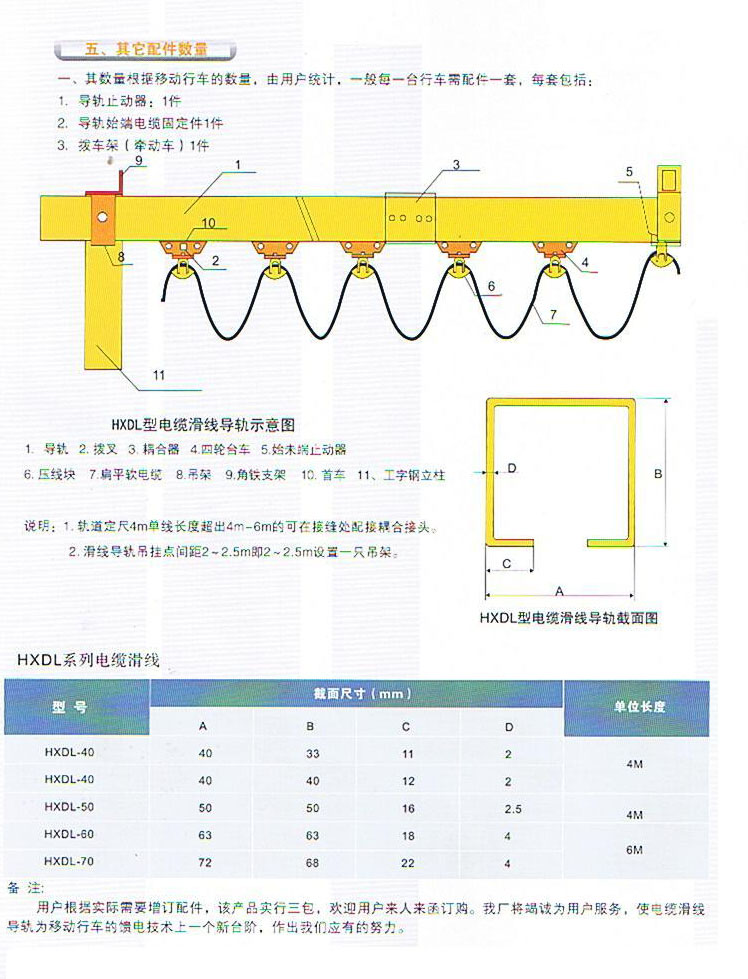 產(chǎn)品詳細(xì)描述電纜滑軌-電纜滑車】 HXDL 電纜滑線導(dǎo)軌 一:HXDL系列電纜滑軌-電纜滑觸線由軌道、攜纜小車、電纜以及懸吊、固定等