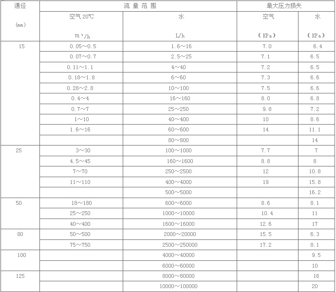 1.測(cè)量范圍:水(2.5~6000)L/h;空氣(0.07~2000)m3/h (在0.101025 MPa、20℃)。