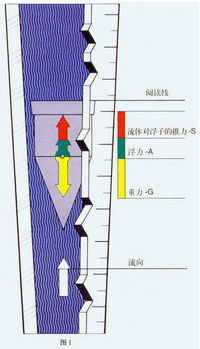 轉(zhuǎn)子式流量計(jì)是一種變面積式流量計(jì),它通常具有一段直立的錐管和一只可以在其中自由的隨流量大小上下移動(dòng)的浮子(如圖1)。當(dāng)流體自下而上流經(jīng)錐管時(shí),流體的動(dòng)能在浮子上產(chǎn)生的推力S和流體的浮力A使浮子上升。隨著錐管內(nèi)壁與浮子之間的環(huán)形流通面積增大,流體動(dòng)能在浮子上產(chǎn)生的推力S隨之下降。當(dāng)推力S與浮力之和等于浮子自身重力G時(shí),浮子處于平衡,并穩(wěn)定在某一高度上,該高度位置對(duì)應(yīng)的刻度指示流過(guò)流量計(jì)的流量。 |