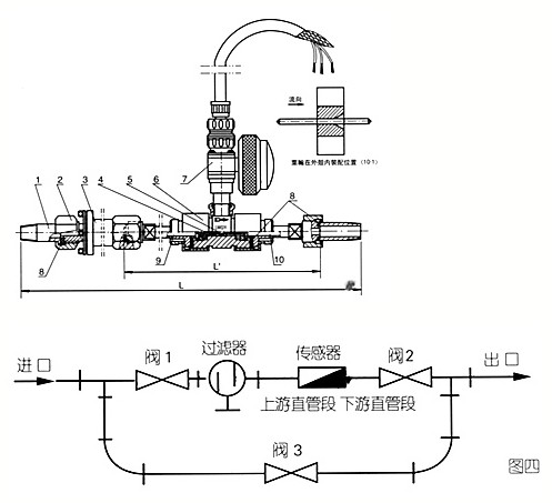 4、為了檢修時不至影響液體的正常輸送,應(yīng)在傳感器兩端的直管段外安裝旁通管道(如圖四);