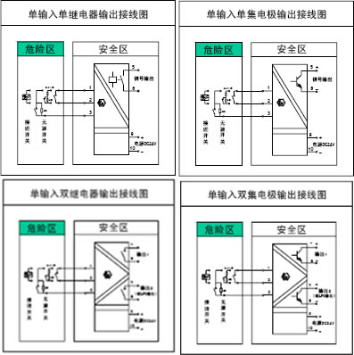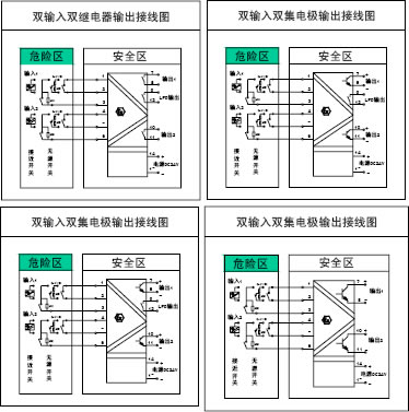 | 檢測端安全柵-開關(guān)量輸入/輸出 單/雙通道(MGEXA-C5)安全柵 該安全柵將來自危險(xiǎn)區(qū)的有源或無源開關(guān)量信號,熱電阻通過隔離安全柵傳輸?shù)桨踩珗龊希瑑x表具有開關(guān)斷線檢測功能,智能隔離器輸出方式有繼電器或集電極輸出方式,同時可進(jìn)行正、反作用選擇。 防爆標(biāo)志: [Exia]ⅡC 該安全柵通道數(shù): 單/雙通道 危險(xiǎn)區(qū)允許輸入信號: 無源輸入信號為純開關(guān)接點(diǎn)。 有源信號:輸入信號>2.1mA時,表示為“開”(ON) 輸入信號<1.2mA時,表示為“關(guān)”(OFF) 供電電壓:8V(開路電壓) 短路電流:約8mA 該安全柵向安全區(qū)輸出信號: 響應(yīng)時間小于50ms 繼電器常閉(常開)接點(diǎn)輸出,允許(阻性)負(fù)載: AC125V 0.5A,DC24V 1A 集電極開路輸出 無源、外部供電:<40V DC,開關(guān)頻率≤5KHz 電流輸出≤40mA,短路電流<100mA 線路故障檢測(LFD): 如果輸入電流<50uA(斷線)或>6mA(短路),輸出開路。 注意:如果防止誤觸發(fā)LFD,熱電偶開關(guān)類傳感器必須接上電阻,或組件開關(guān)可設(shè)置成無LFD功能 國家儀器儀表電器產(chǎn)品質(zhì)量監(jiān)督檢驗(yàn)中心(CQST)認(rèn)證參數(shù)(1、2端子間);(1、3端子間),(4、5端子間);(4、6端子間): Um=250VAC/DC Uo=10.5V,Io=16.2mA, Po=42.5mW ⅡC :Co=1.7μF, Lo=94.8mH ⅡB :Co=11.8μF, Lo=284.4mH ⅡA :Co=52.5μF, Lo=758.4mH 開關(guān)量輸入/輸出 單/雙通道(SYEXA-C5)安全柵功耗: 1.1W 連接的現(xiàn)場設(shè)備及所處區(qū)域: 符合DIN9234的NAMUR接近開關(guān)、開關(guān)等現(xiàn)場設(shè)備(包括:本安型的壓力開關(guān)、溫度開關(guān)、液位開關(guān)等): 0區(qū)、1區(qū)、2區(qū)、ⅡA、ⅡB、ⅡC,T4~T6、危險(xiǎn)區(qū) 該安全柵選型方法: