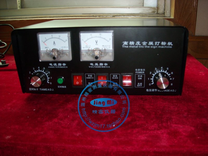 2.調(diào)節(jié)電壓至合適的伏數(shù):通常在8~10V之間(原則上應(yīng)在保證打標清晰度的前提下,使用盡可能低的電壓以保護模版,這點很重要?。?/p>