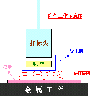 ③用打標頭(連接機器上的正極)蘸打標液,通過模版壓在工件(連接機器上的負極)上幾秒;