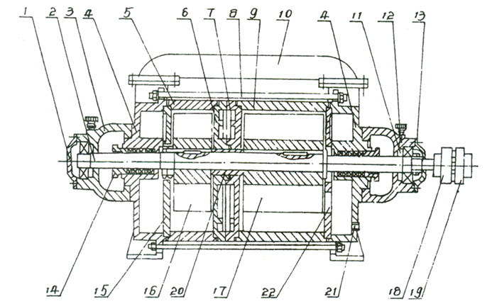 | 1、后軸承壓蓋 2、軸 3、軸承架 4、前后端蓋 5、短泵體 6、中間壁(B) 7、中間壁(A) 8、拉緊螺栓 9、長泵體 10、連通管 11、調(diào)整墊 12、油杯 13、前軸承壓蓋 14、填料壓蓋 15、后蓋園盤 16、短葉輪 17、長葉輪 18、泵聯(lián)軸器 19、電機(jī)聯(lián)軸器 20、軸套 21、進(jìn)水孔 22、前蓋園盤 |