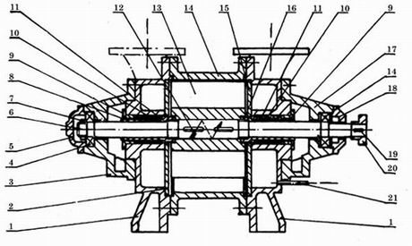 9. 填料壓蓋 10.填料壓圈 11.填料 12.平鍵 13. 葉輪 14.泵體 15.吸氣園盤 16.前軸套 17.前軸承架 18.前軸承壓蓋 19.平鍵 20.聯(lián)軸器 21.進水管