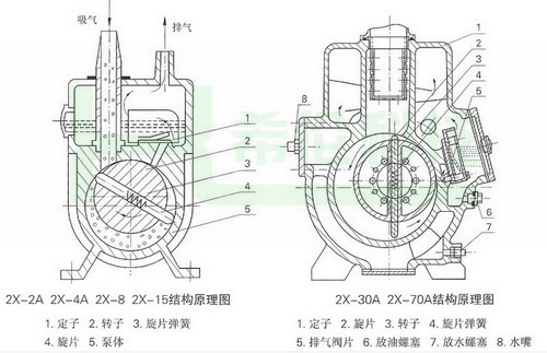 2XZ型旋片式真空泵具有體積小、重量輕、噪聲低、起動(dòng)方便等優(yōu)點(diǎn)。此外,還有防止返油的措施(2XZ-8無)和防止油封漏油污染場地的措施。