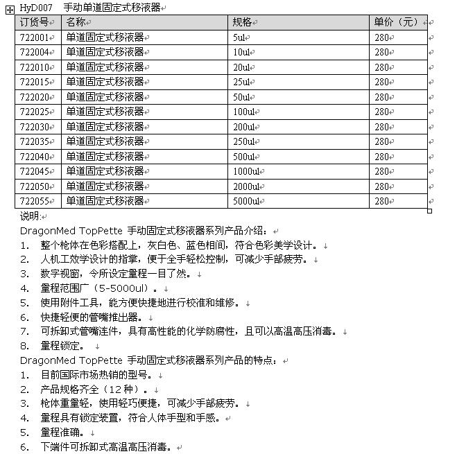 說明: DragonMed TopPette 手動固定式移液器系列產(chǎn)品介紹: 1. 整個槍體在色彩搭配上,灰白色、藍(lán)色相間,符合色彩美學(xué)設(shè)計。 2. 人機(jī)工效學(xué)設(shè)計的指掌,便于全手輕松控制,可減少手部疲勞。 3. 數(shù)字視窗,令所設(shè)定量程一目了然。 4. 量程范圍廣(5-5000ul)。 5. 使用附件工具,能方便快捷地進(jìn)行校準(zhǔn)和維修。 6. 快捷輕便的管嘴推出器。 7. 可拆卸式管嘴連件,具有高性能的化學(xué)防腐性,且可以高溫高壓消毒。 8. 量程鎖定。 DragonMed TopPette 手動固定式移液器系列產(chǎn)品的特點: 1. 目前市場熱銷的型號。 2. 產(chǎn)品規(guī)格齊全(12種)。 3. 槍體重量輕,使用輕巧便捷,可減少手部疲勞。 4. 量程具有鎖定裝置,符合人體手型和手感。 5. 量程準(zhǔn)確。 6. 下端件可拆卸式高溫高壓消毒。