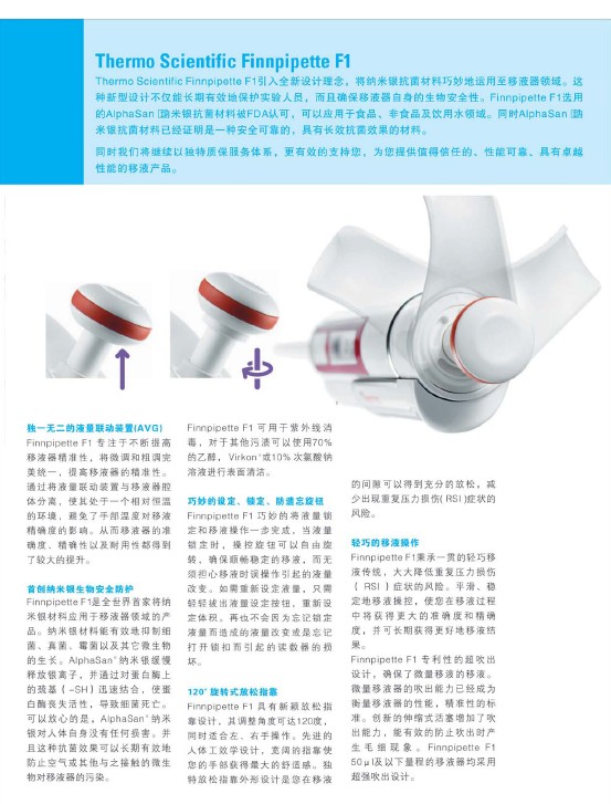 thermo F1多道移液器引入全新設(shè)計理念,獨家將納米銀抗菌材料巧妙運用至移液器領(lǐng)域。該新型設(shè)計不僅確保移液器自身的生物安全性,而且能長期有效地保護實驗人員。F1選用的AlphaSan ®納米銀抗菌材料經(jīng)FDA認證,可用于食品、非食品及飲用水領(lǐng)域。