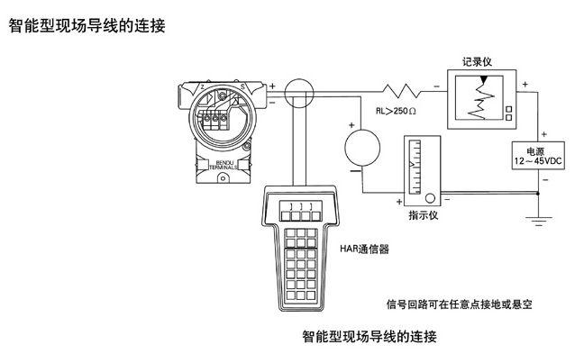 壓力指示儀表的輸入是4~20mA的,則變送器輸出信號可直接接入;如果壓力指示儀表的輸入是1~5V的則必須在壓力指示儀表的輸入端并接一個精度在千分之一及以上、阻值為250Ω的電阻,然后再接入變送器的輸入。