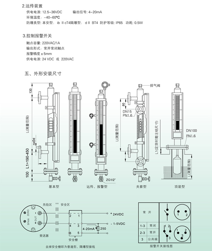 l 上下限開關(guān)輸出 利用磁性浮子隨液位移動(dòng),使安裝在液位計(jì)立管設(shè)定位置的簧片開關(guān)動(dòng)作,實(shí)現(xiàn) ON-OFF 控制或報(bào)警。