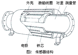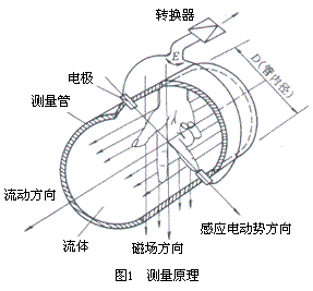 電磁流量計(jì)傳感器結(jié)構(gòu)(見(jiàn)下圖)測(cè)量管上下裝有激磁線圈,通激磁電流后產(chǎn)生磁場(chǎng)穿過(guò)測(cè)量管,一對(duì)電極裝在測(cè)量管內(nèi)壁與液體相接觸,引出感應(yīng)電勢(shì)并將感應(yīng)電勢(shì)E作為流量信號(hào),傳送到轉(zhuǎn)換器,經(jīng)放大,變換濾波用一系列的數(shù)字處理后,用帶背光的點(diǎn)陣式液晶顯示瞬時(shí)流量和累積流量。轉(zhuǎn)換器有4~20mA輸出,報(bào)警輸出及頻率輸出,并設(shè)有RS-485等通訊接口,并支持HART和MODBUS協(xié)議。