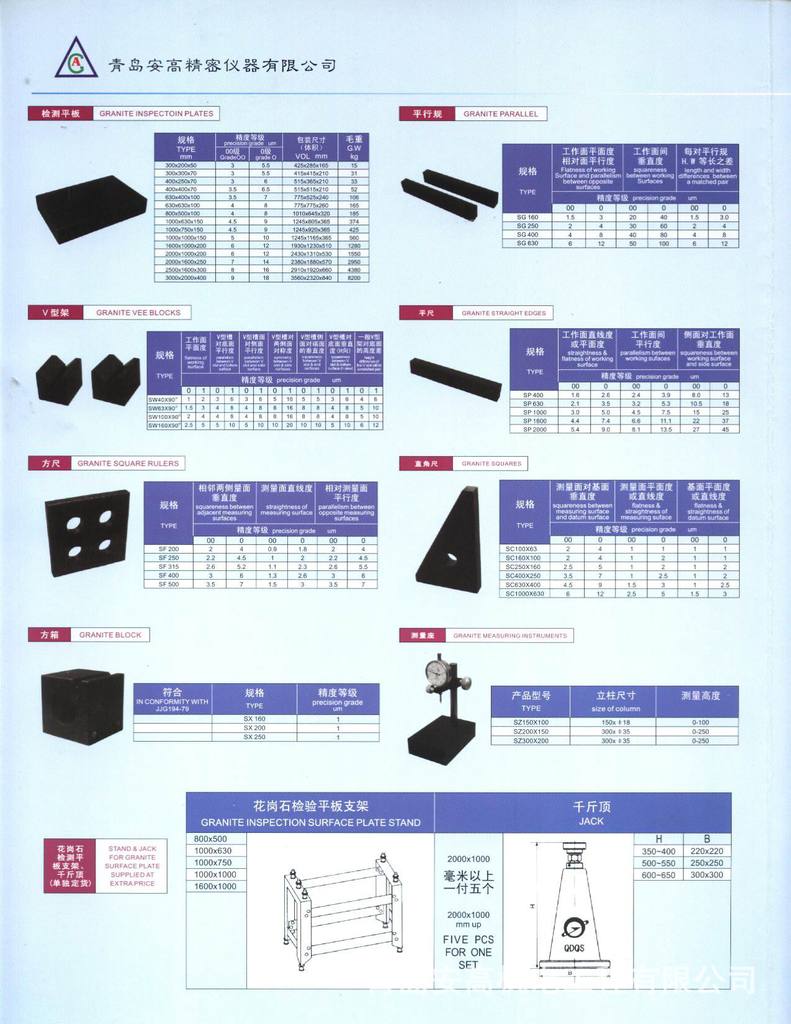 青島安高機(jī)電工程有限公司,是一家集設(shè)計、鑄造、加工為一體的專業(yè)性現(xiàn)代化公司。鑄鐵量具生產(chǎn)部:年生產(chǎn)各類鑄件4000余噸,可生產(chǎn)HT200、250、300等各牌號大、中、小型鑄件及各種工量具。按國標(biāo)生產(chǎn)各種規(guī)格鑄鐵檢驗平板、劃線平板、焊接平臺、T型槽平臺、組合平臺、模具墊板、各類發(fā)動機(jī)實驗臺、落地鏜銑床輔助平臺、平行平尺、橋型平尺、方箱、直角尺、V型鐵、偏擺檢查儀、特殊規(guī)格帶表內(nèi)外卡規(guī)、數(shù)顯百千分表、磁力表座、機(jī)床檢驗棒、機(jī)床調(diào)整墊鐵、機(jī)床防震墊鐵等工量具。鉗工維修工具產(chǎn)品有:平面刮刀、三角刮刀、半圓刮刀、蛇頭刮刀、柳葉刮刀;設(shè)有機(jī)械加工,精密恒溫加工、維修、計量檢測等車間,擁有大型精密石材加工和先進(jìn)的電子檢測設(shè)備,產(chǎn)品全部采用計算機(jī)數(shù)據(jù)處理,主要產(chǎn)品有花崗石精密測量平板、平尺、方尺、直角尺、方箱、彎板、V型塊、平行規(guī)、各類表座,公司是集精密加工異型加工于一體的大型花崗石精密產(chǎn)品的生產(chǎn)企業(yè)。是鑄鐵檢測產(chǎn)品和花崗石計量檢測產(chǎn)品的專業(yè)化制造商。工廠也接受非標(biāo)準(zhǔn)產(chǎn)品的定單,在青島發(fā)展二十余年,具有可靠的計量測試技術(shù)咨詢和維修服務(wù)能力,是各種工業(yè)在線檢測設(shè)備的綜合供應(yīng)服務(wù)商。