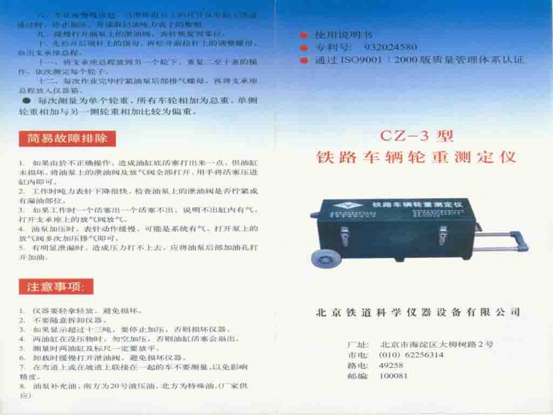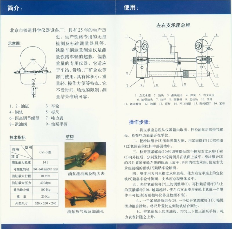 鐵路車輛輪重測定儀,簡稱輪重儀 CZ-3型。是測量鐵路車輛的超載、偏載重量的專用儀器,它適應(yīng)于鐵路車站、貨場、廠礦企業(yè)等使用部門。具有體積小、重量輕,操作方便等特點。它不受時間、場地的限制,測量結(jié)果準確可靠。