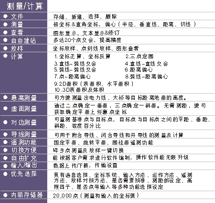 可靠的數據交換工具——DL-01 。通過標準的RS-232C數據接口進行信息交換。DL-01軟件可以用于 PENTAX和PC之間的數據上傳和下載。DL-01還可以與其他軟件之間進行直接的數據交換。它可以在Windows 95,98,2000 和 NT,XP環(huán)境下運行。數據可以轉換為以下格式: Pythagoras 文件、DXF、JS-Info、TDS、SDR、TAB分隔的 ascii 文件、DC -1Z, 用戶可定義的格式和各種其他格式。