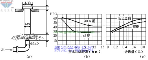 末端淬火試驗(yàn)測(cè)定鋼的淬透性曲線(a)噴水裝置;(b)淬透性曲線舉例;(c)鋼的半馬氏體區(qū)(50%M)硬度與鋼的含碳量的關(guān)系