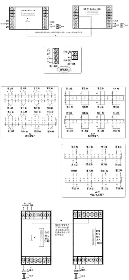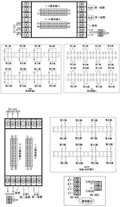 十六路巡檢統(tǒng)一控制/報(bào)警輸出,通訊方式為RS-232,輸出方式為繼電器輸入,輸入類(lèi)型為Pt100,一報(bào)警為上限報(bào)警,第二報(bào)警為下限報(bào)警,帶報(bào)警保持功能,DC24V供電,豎表。