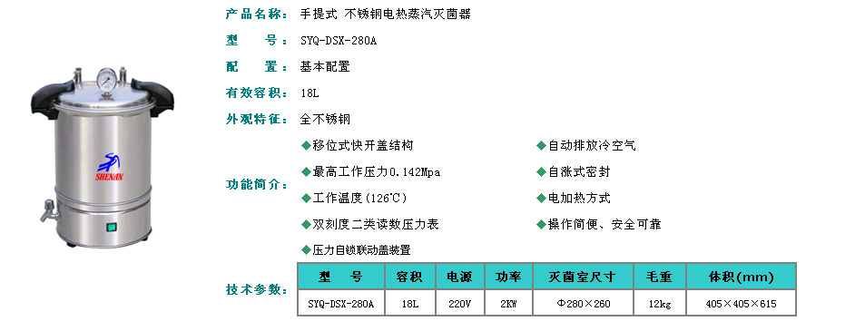 SYQ-DSX-280A 手提式不銹鋼壓力蒸汽滅菌器 (電熱型)]信息由會(huì)員[