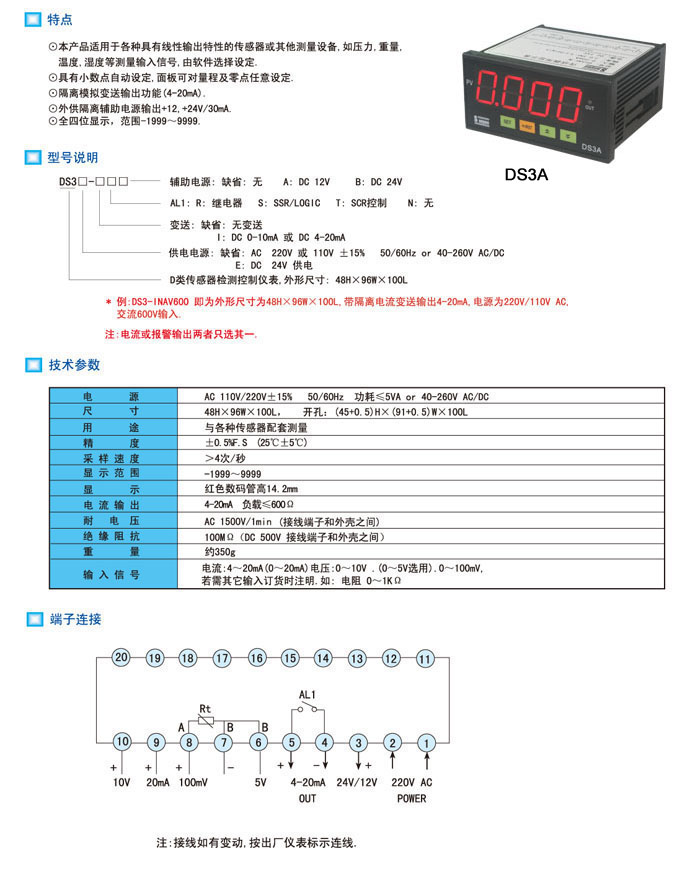 產(chǎn)品描述:DS3A-NB傳感器專用表,全四位0.8寸紅色大數(shù)碼管顯示,清晰直觀,儀表內(nèi)置可輸入0-10V/4-20mA/0-75mV,帶一組24V外供電