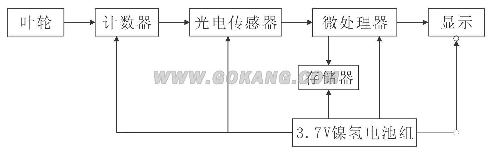 測(cè)量時(shí),因?yàn)槿~輪旋轉(zhuǎn)對(duì)光電傳感器形成遮擋,每遮擋一次就產(chǎn)生一個(gè)光脈沖信號(hào),脈沖信號(hào)經(jīng)計(jì)數(shù)器傳送到微處理器進(jìn)行運(yùn)算處理后,經(jīng)顯示器顯示或存入存儲(chǔ)器保存。主要技術(shù)指標(biāo):