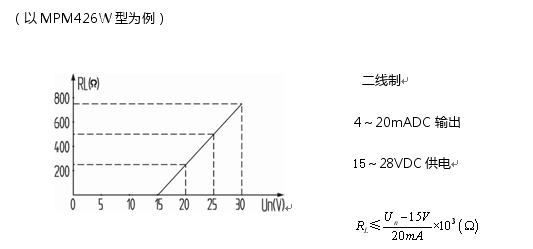?、費PM436W型僅提供兩線制輸出形式的變送器,供電12~30VDC,負載<(U-12)/0.02A-Rwire(Ω),式中U為供電電壓,Rwire為導線電阻。