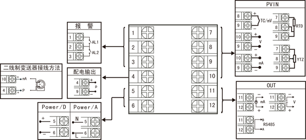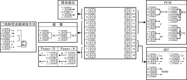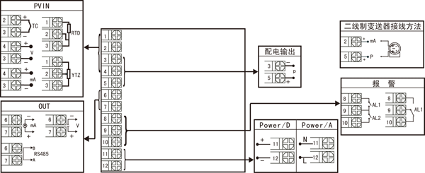 | ★ 注:上述接線圖中在同一組端子標(biāo)有不同功能的,只能選擇其中一種功能。如RS485通訊功能和變送輸出功能在同一組OUT接線端子上,只能選擇一種。 | ||||||||||||||||||||||||||||||||||||||||