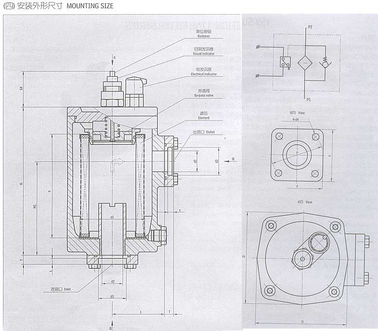 液壓吸油過濾器,新鄉(xiāng)中石達液壓吸油過濾器應用: ISV 系列管路吸油過濾器是由鋁合金外殼、濾芯、旁通閥及自動發(fā)訊器和電發(fā)訊器構(gòu)成的輕質(zhì)而堅固的帶外殼吸油過濾器,應豎直安裝在油箱外的管路上,不影響管路的布置,油箱的尺寸不受過濾器的限制。該系列過濾器具有以下特點:1、帶目測發(fā)訊器:當濾芯被污染物逐漸堵塞時,目測發(fā)訊器觀察窗內(nèi)的紅色信號環(huán)慢慢上升,當紅色信號環(huán)上升到zui高位置時(觀察窗內(nèi)完全紅色),指示濾芯已被污染物堵塞到需清潔或更換的程度了。清洗或更換濾芯后,按復位按鈕,使紅色信號環(huán)下滑;2、帶電發(fā)訊器:當濾芯北污染物堵塞到出油口的真空度0.018Mpa時,發(fā)訊器內(nèi)的微動開關動作,發(fā)出發(fā)出開關信號,指示應清洗或更換濾芯,如此時又不能馬上停機或無人來更換濾芯,設在過濾器蓋內(nèi)的旁通閥會自動開啟(開啟壓力為:真空度-0.02Mpa);3、帶旁通閥:當濾芯被污染物堵塞到出油口壓力(真空度-0.02Mpa)時,旁通閥會自動開啟,以避免油泵出現(xiàn)吸空等故障。