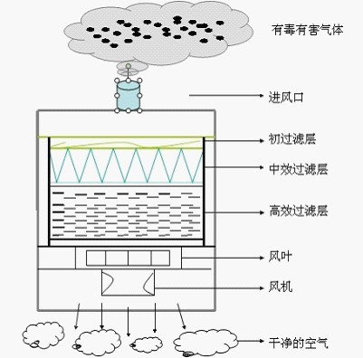 有毒有害氣體/煙霧/粉塵→初效過(guò)濾→中效過(guò)濾→活性碳過(guò)濾→高