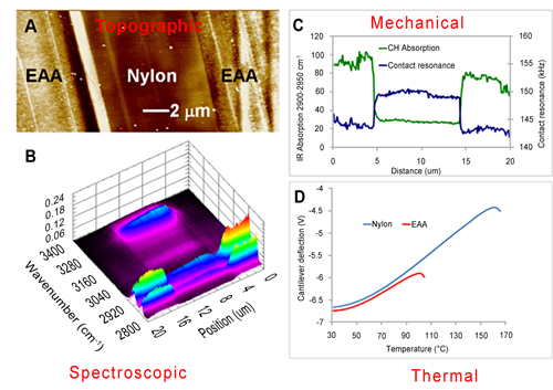 (A)EAA和尼龍多層聚合物的AFM圖像。(B)界面處的線性光譜掃描結(jié)果,顯示了CH和NH的吸收峰。(C)化學組成和機械性能的同時表征。綠色曲線顯示了在2900cm-1到2950cm-1之間CH鍵吸收強度,而藍色曲線則顯示了界面處機械剛度的相對變化。(D)納米熱分析模塊測試(nanoTA)結(jié)果表明尼龍和EAA存在不同的軟化溫度。