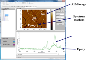 美國Anasys儀器公司的nanoIR軟件能夠很容易獲取納米尺度下吸收光譜。先,選定試樣的一個區(qū)域,采集AFM圖像,然后點擊你希望獲取紅外光譜的位置。該軟件能夠自動記錄你所點擊的位置,從而讓空間形貌和光譜信息之間的聯(lián)系變得非常容易。同時,光譜也很容易被輸送到第三方光譜分析軟件。