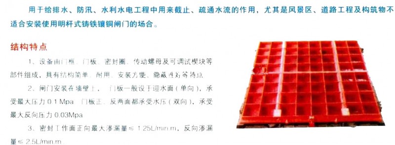 MXF型鑲銅鑄鐵方閘門及配套的QD型手電兩用啟閉機主要應用于城市給排水行業(yè)中,用以截止、調整水流水位,其安裝、維護簡單方便,使用安全可靠。我公司生產(chǎn)的MXF型鑲銅鑄鐵方閘門的安裝方式可采用靠墻式安裝、法蘭式安裝、澆嵌式安裝等形式,具體根據(jù)用戶需要和特定條件而定。QD型啟閉機是一種多功能的手電兩用啟閉機,啟閉機上配有高度指示器,使用可靠、方便。本套產(chǎn)品通常由:鑲銅鑄鐵方閘門、手電兩用啟閉機、門框、閘板、軸導架和緊固螺栓等組成。