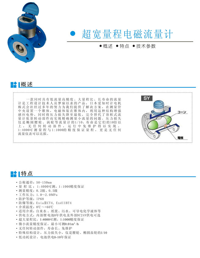 SY系列超寬程電磁流量計(jì)(日本進(jìn)口)是一款低流量、大量程比、長壽命的流量計(jì),無任何可動(dòng)部件,運(yùn)行中免維護(hù)得以實(shí)現(xiàn)。1:4000可測,1:1000精度保證。日本愛知時(shí)計(jì)電株式會(huì)社經(jīng)過多年的努力為我們提供了解決方案,在測量管中央設(shè)置一個(gè)錐體,電磁體裝在錐體內(nèi),利用這種結(jié)構(gòu)增強(qiáng)感應(yīng)電勢,同時(shí)將壓力損失降至zui低,完全替代了容積式流量計(jì)依靠轉(zhuǎn)動(dòng)部件而實(shí)現(xiàn)測量小的問題。