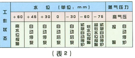 1、控制參數(shù)(350mm):(見表2) 2、水位顯示:汽紅水綠。 3、警響:(見表1) 4、儀器工作環(huán)境: 環(huán)境溫度:一30℃--+50℃相對濕度:88%(40℃時(shí))