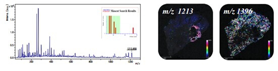 使用 μMatrix Spotter對進(jìn)行胰蛋白酶消解后的乳腺癌組織MALDI-TOF MS。質(zhì)譜成像顯示肽m/z 1213和1396的分布;肽m/z 1213通過MS/MS分析被識別為人類Igα-2 鏈。