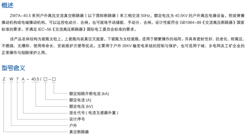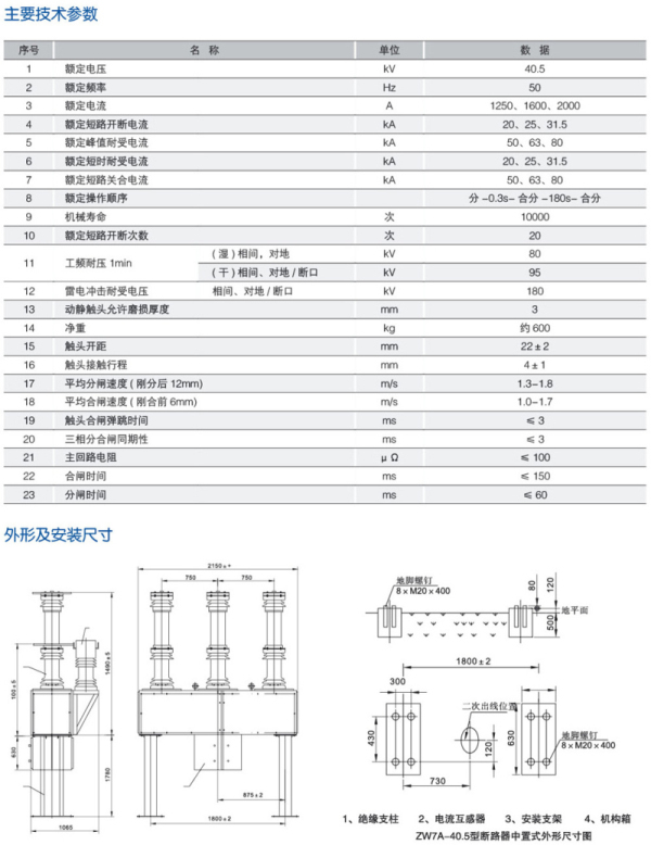 ZW7A-40.5系列戶外高壓交流真空斷路系三相交流50Hz,額定電壓為40.5kv的戶外高壓電器設(shè)備,附裝彈簧操動機構(gòu)或電磁操動機構(gòu),可以遠控電動分、合閘,也可就地手動分、合閘。