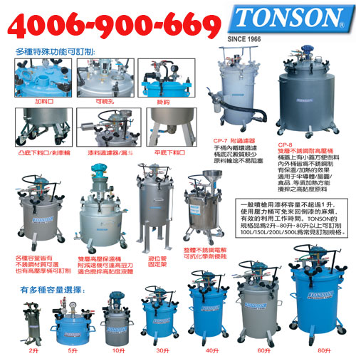 | 全自動高速傳送料機(壓力桶)裝有活塞式氣動馬達,作攪拌裝置,壽命長,無危險性,能使上下不均勻之涂料不至于(沉淀)保持顏色一致永遠謠遙于市場.通又順壓力桶以焊接法制成,壁厚均勻,耐高壓,防爆 |