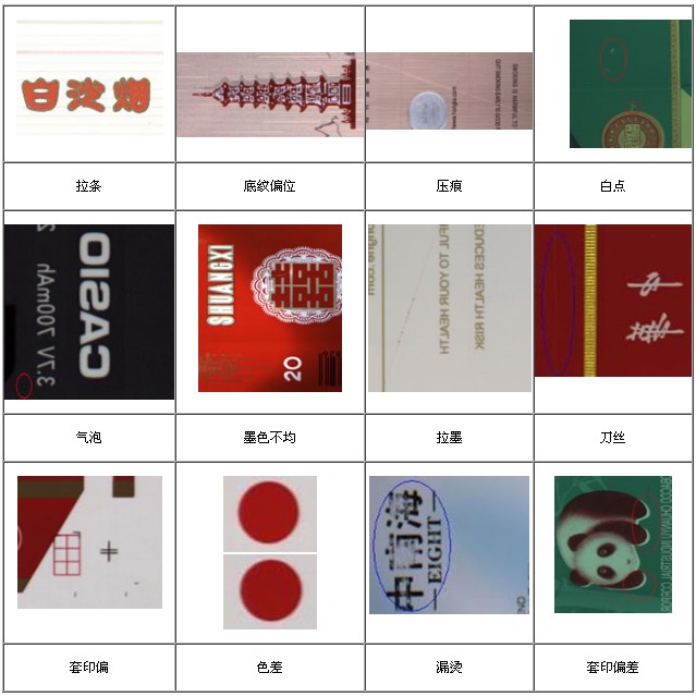 大恒圖像印刷質(zhì)量檢測產(chǎn)品檢測缺陷樣例: