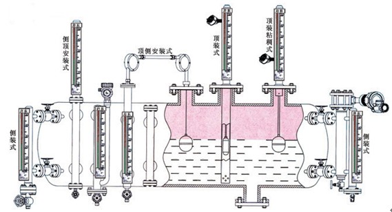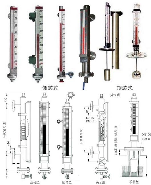 ⑶(側頂型),它是由磁性浮球、浮標、側裝本體組件、面板框等部件組成,顯示位置為側面頂部,適于高溫、高粘稠介質或側開孔容器。