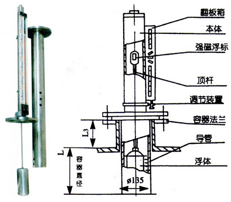 ⑴(普通型),它是由本體、浮子、面板框等部件組成。液位計與容器上下法蘭連接,連接時中間加閥門,安裝在一側。它適用于在不需要保溫或冷卻,且介質對奧氏體不銹鋼不腐蝕的場合。