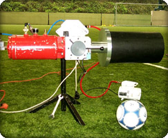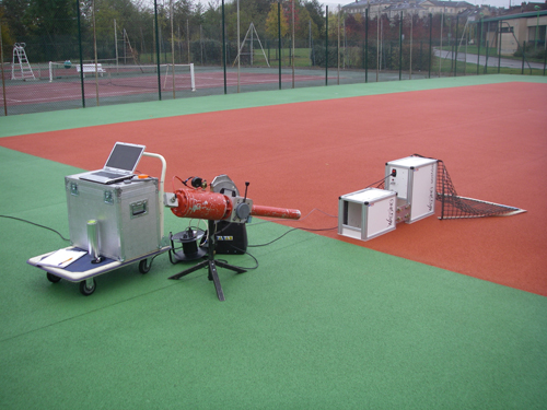 One of the requirements for artificial turf surfaces is the ball rebound behaviour under an angle.Deltec developed an Angle Ball Projector to determine this ball bouncing characteristic.The portable pneumatic ball projector launches the ball with exactly 50 km/h at the required 15 degrees angle.The projector is completely self-supporting regarding energy when used in the field,so it can be used under all circumstances.The ball is launched without spin the with a very accurate reproducible speed.The reproducibility exceeds the demands by far.A radar gun (not supplied by Deltec)measures the horizo