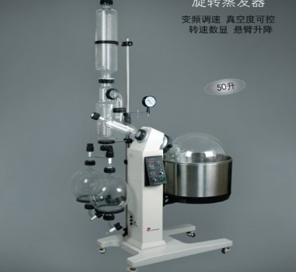 旋轉(zhuǎn)蒸發(fā)儀主要用于在減壓條件下連續(xù)蒸餾大量易揮發(fā)性溶劑。尤其對萃取液的濃縮和色譜分離時的接收液的蒸餾,可以分離和純化反應(yīng)產(chǎn)物。旋轉(zhuǎn)蒸發(fā)儀的基本原理就是減壓蒸餾,也就是在減壓情況下,當溶劑蒸餾時,蒸餾燒瓶在連續(xù)轉(zhuǎn)動。結(jié)構(gòu):蒸餾燒瓶可是一個帶有標準磨口接口的梨形或圓底燒瓶,通過一高度回流蛇形冷凝管與減壓泵相連,回流冷凝管另一開口與帶有磨口的接收燒瓶相連,用于接收被蒸發(fā)的有機溶劑。在冷凝管與減壓泵之間有一三通活塞,當體系與大氣相通時,可以將蒸餾燒瓶,接液燒瓶取下,轉(zhuǎn)移溶劑,當體系與減壓泵相通時,則體系應(yīng)處于減壓狀態(tài)。使用時,應(yīng)先減壓,再開動電動機轉(zhuǎn)動蒸餾燒瓶,結(jié)束時,應(yīng)先停機,再通大氣,以防蒸餾燒瓶在轉(zhuǎn)動中脫落。作為蒸餾的熱源,常配有相應(yīng)的恒溫水槽。