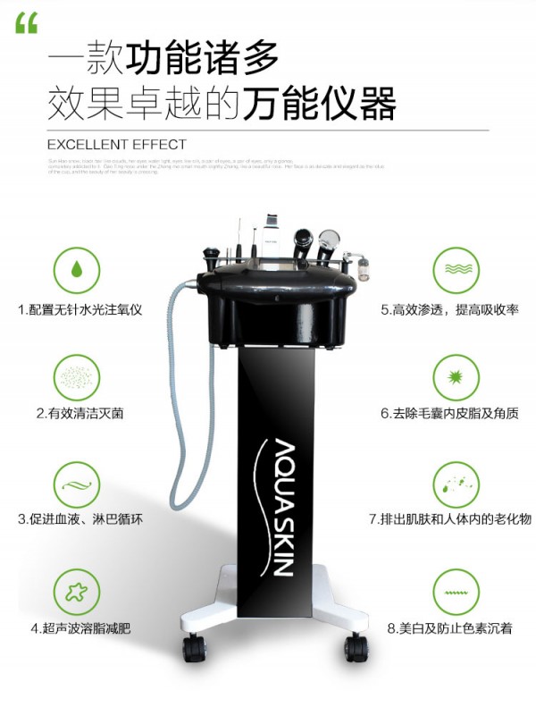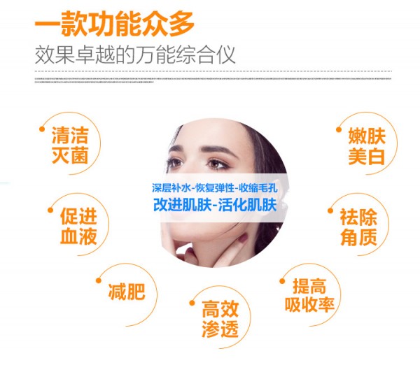 AQUA SKIN第三代綜合儀!全新升級(jí)為多功能觸屏顯示,并加入了智能圖片識(shí)別,再也不用擔(dān)心操作會(huì)按錯(cuò)鍵的問題!加入了面部磁石導(dǎo)入,讓精華有效的吸收,亮點(diǎn)是加入了水冷的冷溫儀,有利于術(shù)后修復(fù),冰鎮(zhèn)褪紅。原有電離子功能,微電流滾輪,噴氧,去角質(zhì)鏟不變,機(jī)器功能強(qiáng)勁,操作簡(jiǎn)單,智能!真正的一機(jī)多用!
