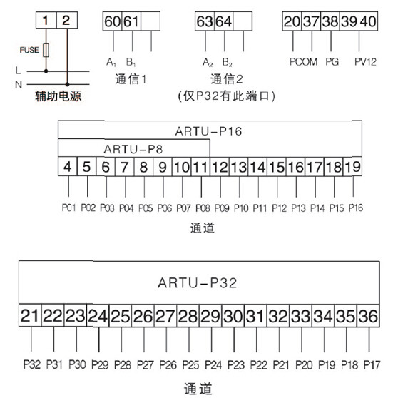 無源接點(diǎn):Pi(i=1-32)與公共端PV12為各通道接入端,同時PCOM和PG短接。
