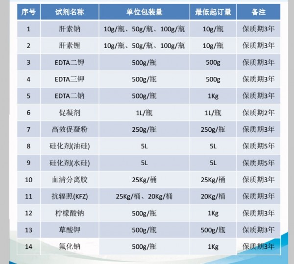 目前我公司主要有:血液標(biāo)本抗凝系列產(chǎn)品,包括肝素鈉、肝素鋰、檸檬酸三鈉、EDTA二鉀、EDTA三鉀、草酸鉀等;血液標(biāo)本促凝系列產(chǎn)品,包括血液促凝粉、血液促凝劑等;血液標(biāo)本前處理所用材料,包括分離膠、硅化劑等;診斷試劑原材料包括:緩沖劑、色原底物的生產(chǎn)及研發(fā),目前色原底物(新型Trinder's試劑)有TOOS、TOPS、ADOS、ADPS、ALPS、DAOS、HDAOS、MADB, MAOS、TODB等。緩沖劑有Tris、Bicine、Caps、Mops、Taps、EPPS等; 。緩沖劑產(chǎn)品,白色晶體,純度>99%,吸光度<0.05。 TOOS,MAOS,TOPS等產(chǎn)品,白色晶體、純度高(大于99%)、溶解性好,有別于市場(chǎng)上淡藍(lán)色或棕色產(chǎn)品。